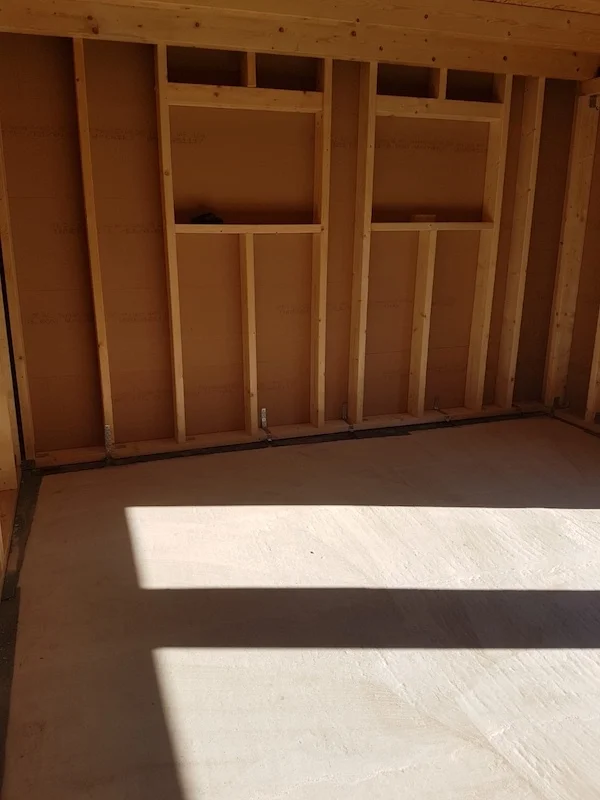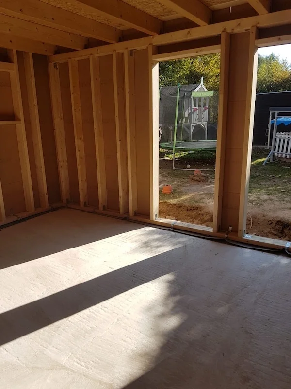 Wie lange ein Anbau insgesamt dauert, hängt von mehreren Punkten ab. Größe, Umfang, Genehmigungen und der Zustand des Bestands spielen eine Rolle. Die eigentliche Bauphase lässt sich mit Holz jedoch deutlich straffer organisieren als bei massiven Bauweisen. Während bei anderen Materialien lange Trocknungszeiten eingeplant werden müssen, kann im Holzbau zügig weitergearbeitet werden. Gerade bei bewohnten Häusern ist das ein Vorteil. Die Zeit, in der das Haus zur Baustelle wird, bleibt überschaubar. Viele unserer Anbauten stehen in kurzer Zeit im Rohbau. Dach, Wände und Decken sind schnell geschlossen. Anschließend folgen Innenausbau und Feinarbeiten.
