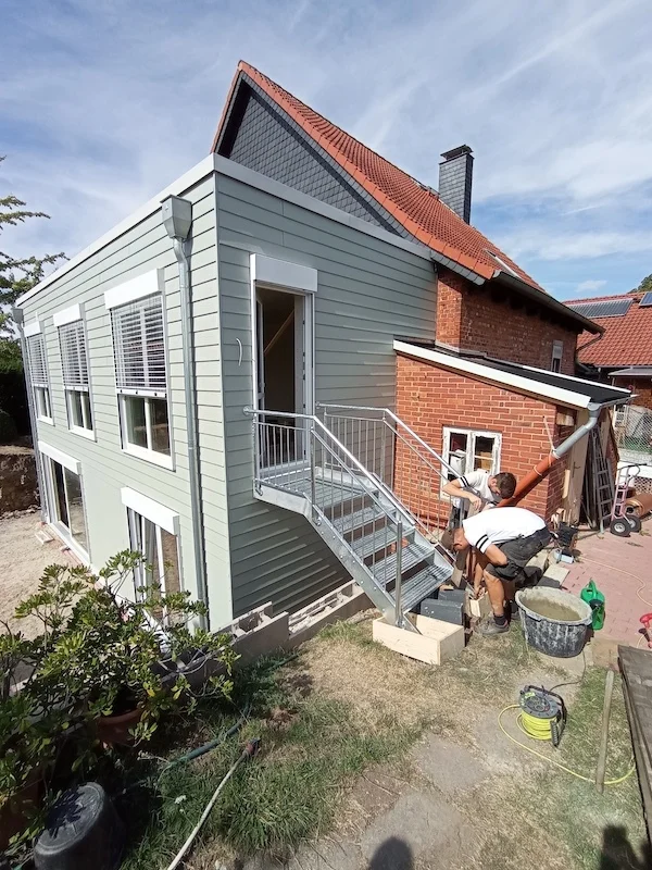Höhenunterschiede lassen sich konstruktiv lösen. In der Praxis arbeiten wir mit angepassten Fundamenten oder Stahlträgern, um einen sauberen, ebenen Übergang zwischen Bestand und Anbau herzustellen. So entsteht kein Stolperniveau, sondern ein durchgängiger Wohnraum. Auch Anbauten über Erd- und Dachgeschoss sind möglich, wenn Statik und Aufbau von Anfang an richtig geplant werden. Dafür verlängern wir zum Beispiel bestehende Dachstühle oder binden neue Konstruktionen gezielt an.