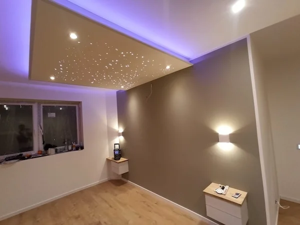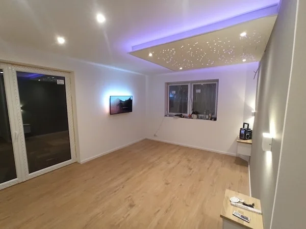 Ein Beispiel aus unserer Praxis: In einem Dachgeschoss haben wir eine zweite Rigipsdecke unter die erste gesetzt. Zwischen den Ebenen war ein Abstand von etwa 10 bis 15 cm, zur Wand blieb ein umlaufender Spalt. Dort wurden dann LED-Schienen eingebaut, farbig und warmweiß steuerbar. Die Decke wirkt dadurch schwebend. Solche Lösungen sehen nur dann gut aus, wenn sie sauber geplant sind. Sonst wirkt es schnell wie nachträglich drangeschraubt. Genau das vermeiden wir.