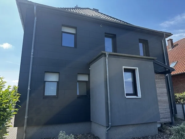Ein Beispiel aus dem Schaumburger Land: Der Klinker einer Immobilie war brüchig, die Fugen versandet, Feuchte saß bereits im Mauerwerk. Wie haben wir reagiert? Wir haben eine neue Unterkonstruktion aus KVH angedübelt und sauber ausgerichtet. Befestigt wurde diese mit Edelstahl. Danach kamen eine Dämmung in zwei Lagen Kreuzverband sowie eine diffusionsoffene Unterspannbahn dazu und wir schufen eine Konterlattung zur Hinterlüftung. Außen kamen Eternitplatten zum Einsatz. Kein Flickwerk. Ein neuer, funktionierender Aufbau. Heute ist die Wand gedämmt, belüftet und wieder geschützt. Und das Haus wirkt ruhig.