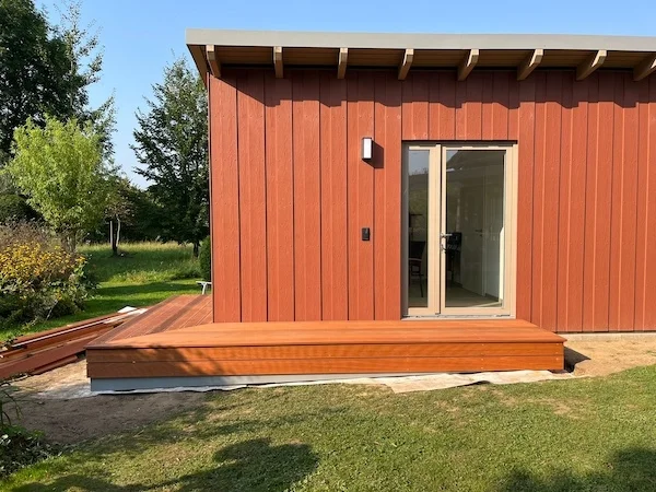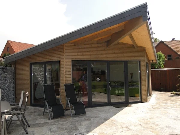 Ja. Gerade bei Reihenhäusern ist das ein typisches Thema. Viele Grundstücke sind eng geschnitten. Dazu kommen Nachbargrenzen, Terrassen, Wege und vorhandene Beete. Da passt kein Standard-Gartenhaus. Und wenn man es trotzdem versucht, steht es am Ende ungünstig oder blockiert den Garten. Wir planen Gartenhäuser so, dass sie den Platz sinnvoll nutzen. Oft arbeiten wir mit schmalen Grundrissen und ergänzen seitlich oder nach vorne einen kleineren Anbau. Damit bleibt das Hauptgebäude nutzbar, ohne dass alles zu eng wirkt.