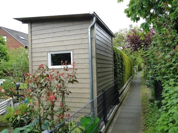 Ein Beispiel aus unserer Praxis: In einer Reihenhaussiedlung haben wir ein sehr schmales Gartenhaus gebaut, weil wenig Platz vorhanden war. Zusätzlich wurde ein kleinerer Anbau ergänzt. Außen wurde grau lasierte Keilschalung verwendet, die Ecken sauber mit Glattkantbrettern abgeschlossen. Wenn Sie uns ein Foto oder eine Skizze schicken, können wir oft schon vorab einschätzen, was möglich ist.