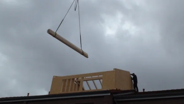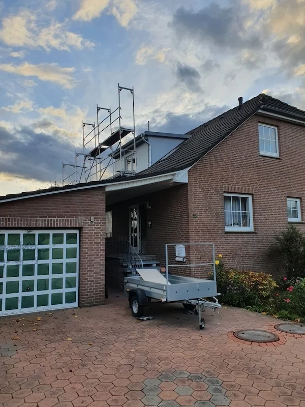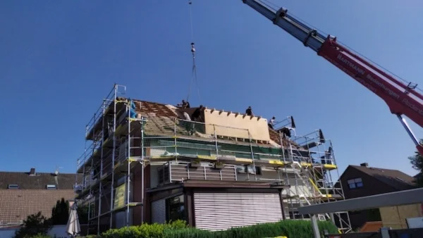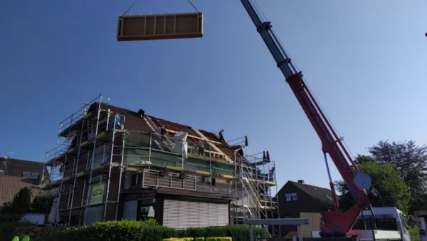 Wenn die Zufahrt eng ist oder wenig Platz am Haus bleibt, setzen wir einen Kran ein. Statt lange zu rangieren oder Bauteile Stück für Stück durchs Haus zu tragen, heben wir vormontierte Elemente direkt an ihren Platz. Das spart Zeit auf dem Dach und sorgt für einen klaren Ablauf. Wir haben das bei Projekten genutzt, bei denen der Dachstuhl auf dem Nachbargrundstück vormontiert und dann per Autokran gesetzt wurde. Wichtig ist auch das Wetter, weil das Dach während der Arbeiten geöffnet wird. Deshalb planen wir so, dass die Dachfläche schnell wieder geschlossen ist. Nach einer Besichtigung können wir Ihnen eine realistische Zeitplanung geben, die zum Haus und zur Jahreszeit passt.