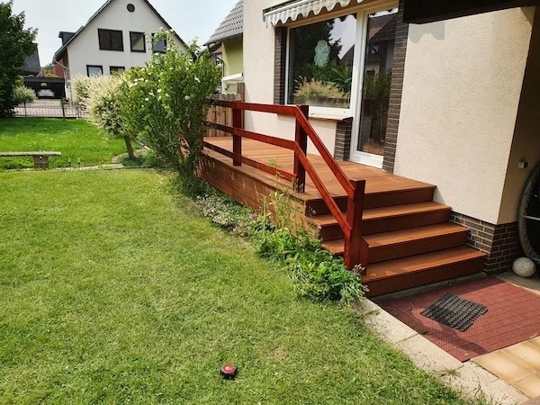 Wir achten auf ausreichenden Abstand zwischen den Dielen, saubere Verschraubung und Gefälle vom Haus weg. Staunässe ist der größte Feind jeder Terrasse. Bei einer Terrasse mit seitlichem Sichtschutz und Stabmattenzaun haben wir robustes Holz gewählt, da die Fläche stark genutzt wurde. Entscheidend war nicht nur das Material, sondern die Entwässerung unter dem Deck. Es gibt kein Material, das ohne Pflege und Planung dauerhaft funktioniert. Die Kombination aus passendem Holz und richtiger Konstruktion macht den Unterschied.